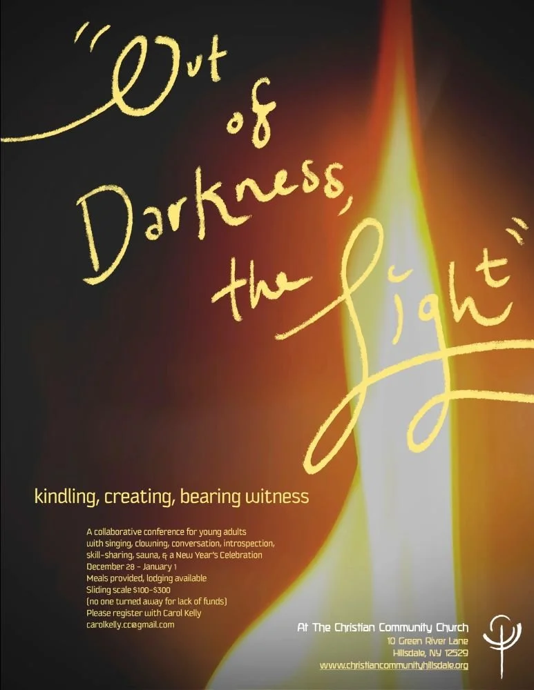 A collaborative gathering: kindling, creating, bearing witness with singing, clowning, conversation, introspection, skill-sharing, sauna, & a New Year's Celebration.